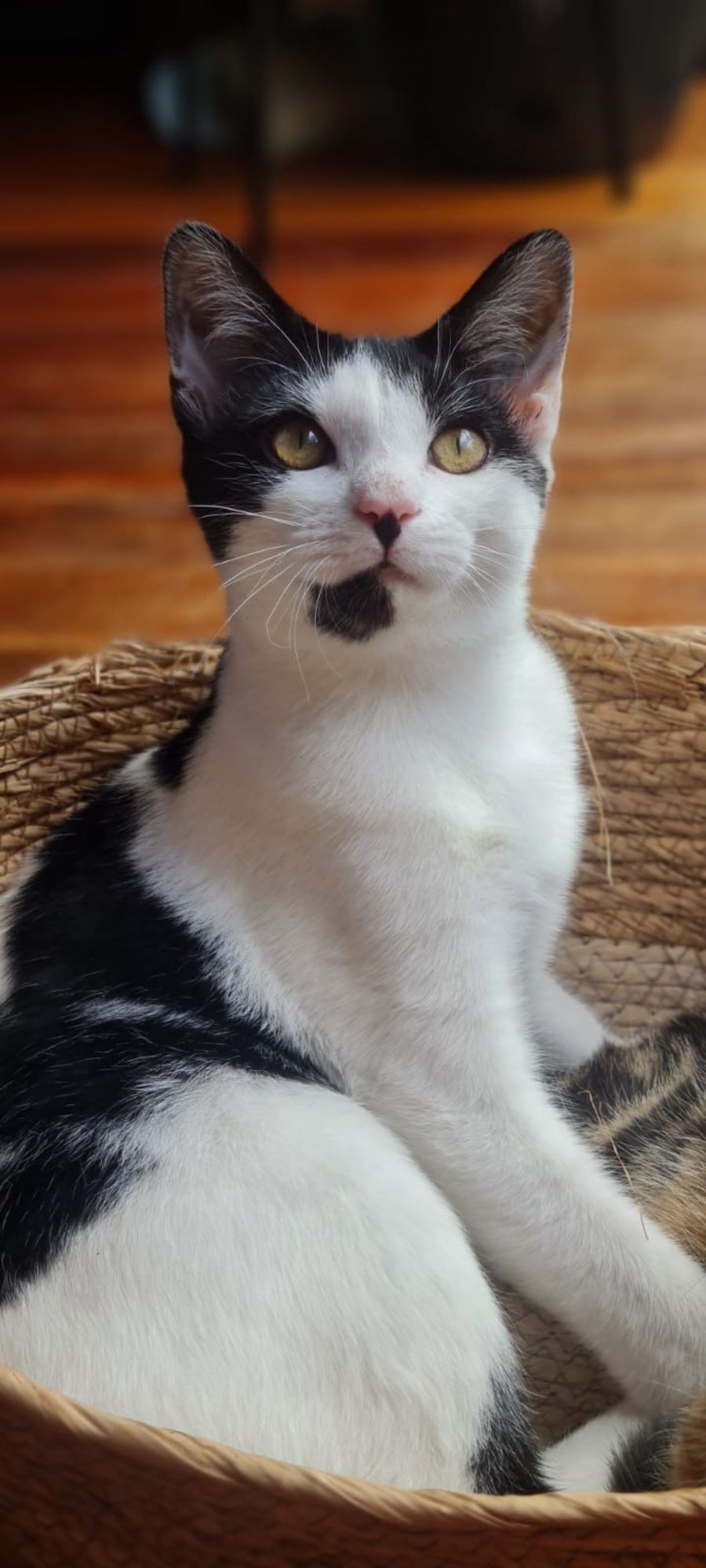 Meet Hendrix, a handsome and confident handsome young cat with distinctive chin markings and gorgeous honey eyes. He is sure to steal the show wherever he goes—his captivating gaze is as charming as his adventurous spirit!