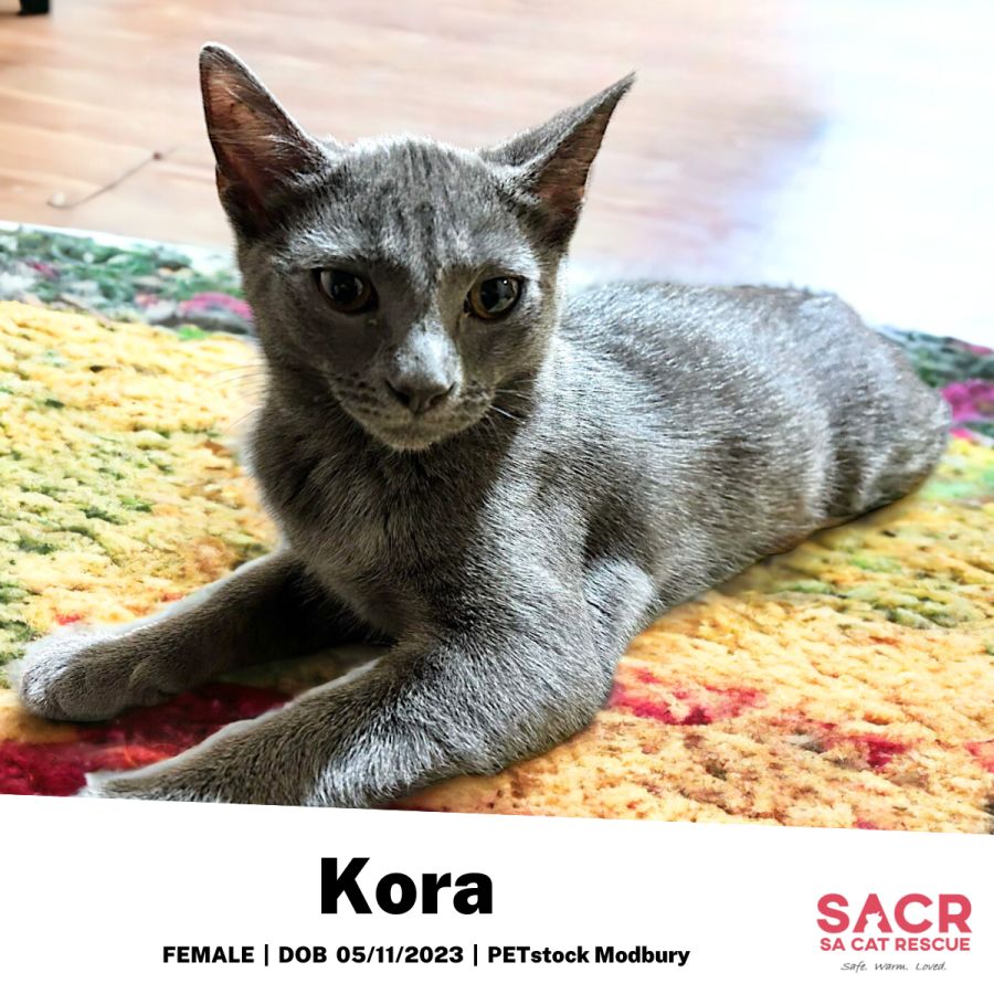 Kora's adoption fee is $180 which includes desexing, microchipping, parasite prevention, and F3 vaccination.