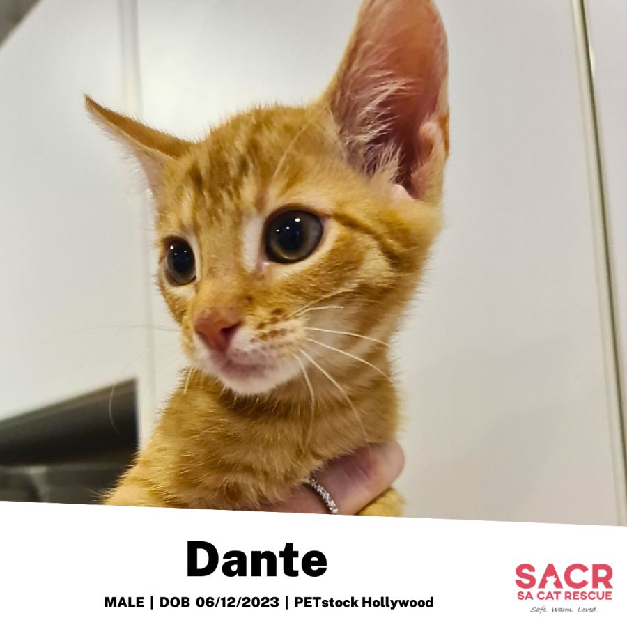 Dante’s adoption fee is $180 which includes desexing, microchipping, parasite prevention, and initial F3 vaccination.
