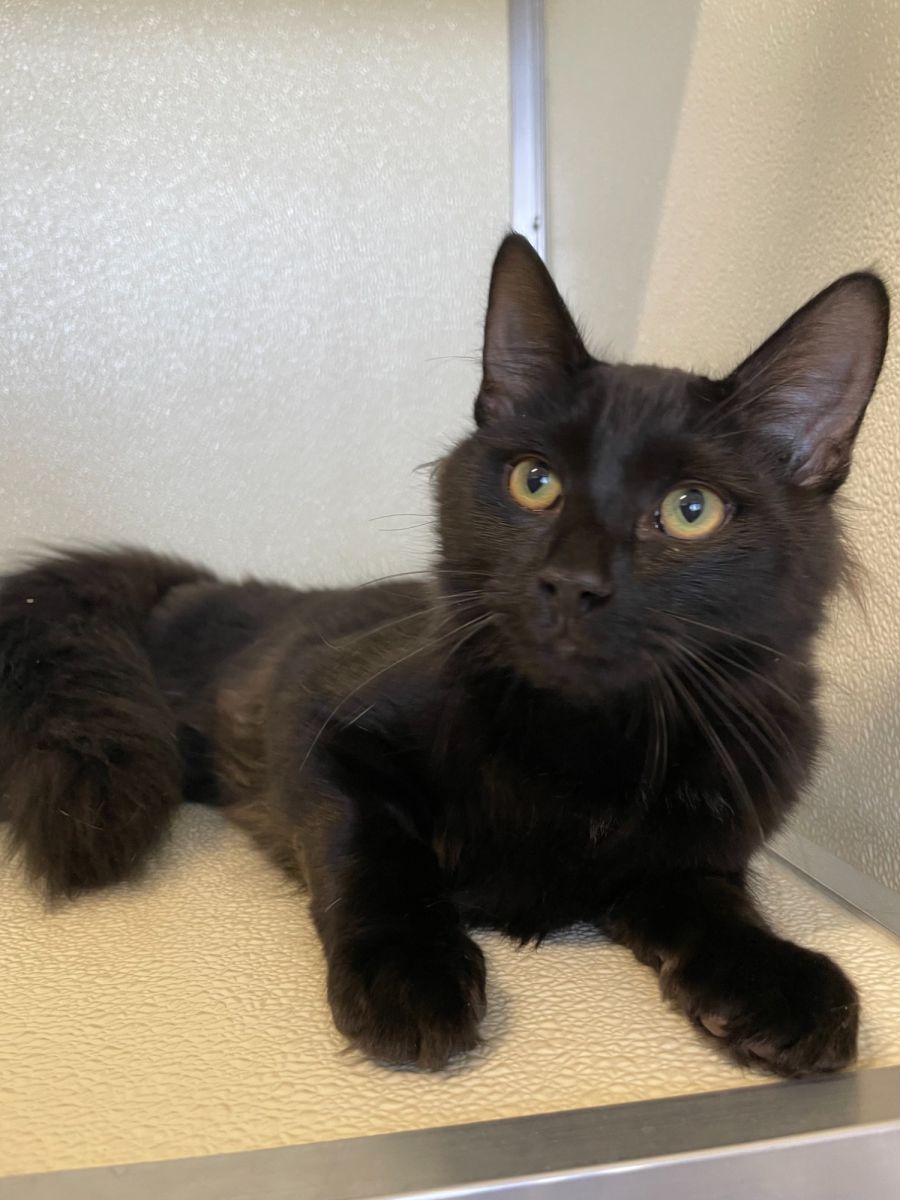 Licorice has a shiny black coat as sweet as his namesake. His striking emerald eyes are full of affection, curiosity, and a hint of mischief. This captivating combination wins over everyone who meets him, making him a much-beloved companion.