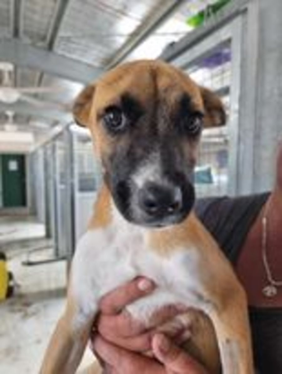 Introducing Maya, a sweet-natured female Husky Boxer mix with sparkling eyes and a playful personality. Only 14 weeks old, this bundle of joy has begun to showcase her friendly demeanor, winning the hearts of all she encounters.
