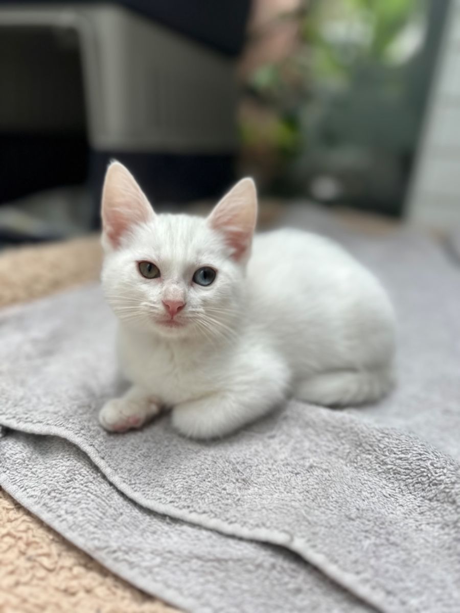 Introducing our uniquely sweet and shy little Aspen. With her intriguing heterochromia iridis condition, her eyes are different colors, adding a unique charm to her that is as rare as Aspen herself. This wonderful attribute is primarily a genetic condition carried by the same gene that makes cats white, lending Aspen an air of distinction.
