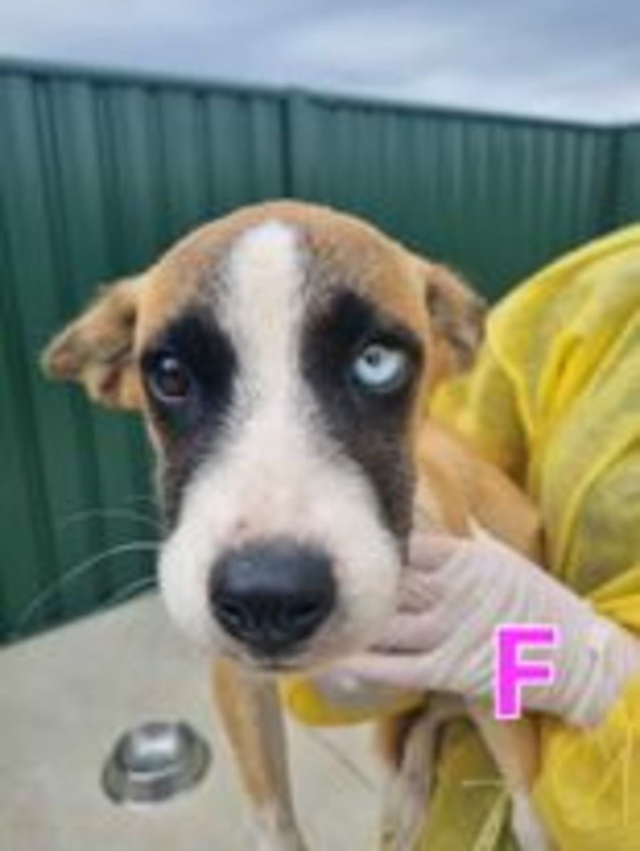 Meet Molly, a delightful husky-boxer mix puppy. At just 14 weeks old, Molly is already a show-stopper with her enchanting blue and brown eyes. She has a sweet nature that will win you over every single time, with a wag of her tail and her loving gaze.