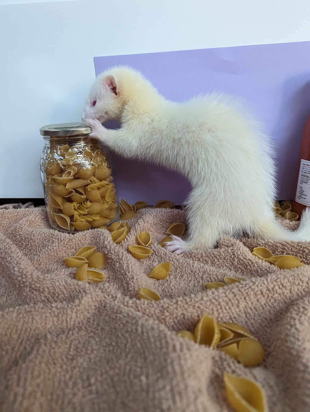 Ferrets are very inquisitive, intelligent and energetic animals (when they are awake) This means that these little ones will need lots of toys to keep them entertained. They have lived indoors all of their life so they will need to live indoors in a secure space so that they don't escape. These little pastas can be adopted together or separately, though if they are adopted separately there will need to be an existing ferret at home.