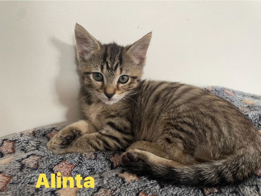 While she adores and plays well with her feline friends, Alinta's heart lies with her dedicated humans. There's nothing more precious to her than sharing a cozy spot with her special people and enjoying some cuddle time. She may be an everyday tabby in appearance, but her spirited personality will captivate you.