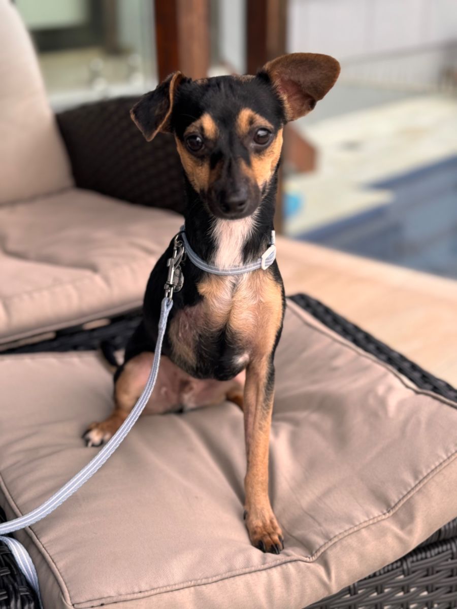 When Taco isn’t out and about, he loves to stay close to his humans. He’s content to snuggle up on the sofa next to his favorite people, or snooze in his crate. Taco is a well-behaved boy who settles quickly when left alone, prefers dry grass for toilet usage, and adapts quickly to new environments with a little love and patience.