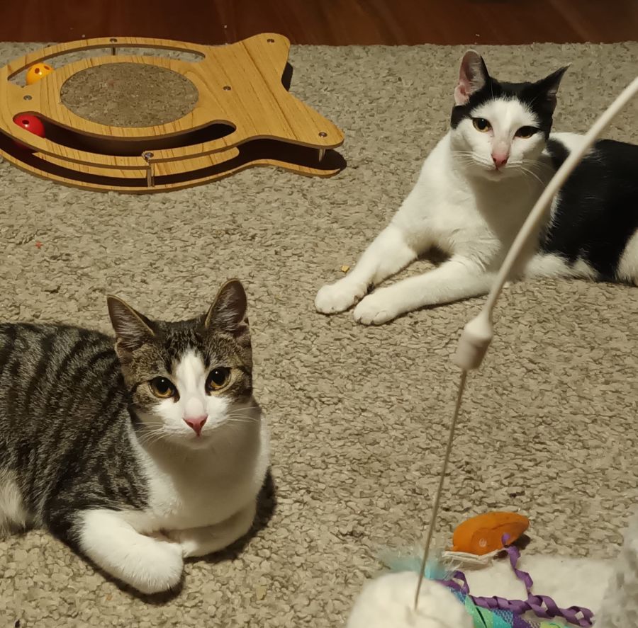 Both cats are incredibly affectionate and playful. They love to indulge in games of chase around the house, but they're equally happy curling up together on the sofa for some quality cuddle time. They both have an affinity for children, having bonded with a teenager in their previous home, and have shown that they can comfortably co-exist with small, cat-friendly dogs.