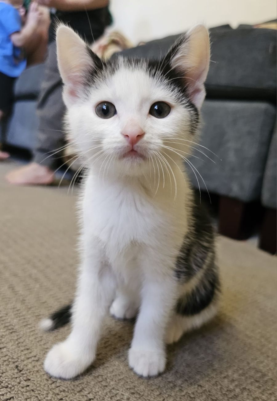 Allow us to introduce Popcorn, a captivating bundle of feline bravery! Popcorn is as adventurous, playful, and curious as they come. With a black and white coat that's uniquely marked with a single white spot on the top of her head, Popcorn's physical appearance is as exciting as her spirit.