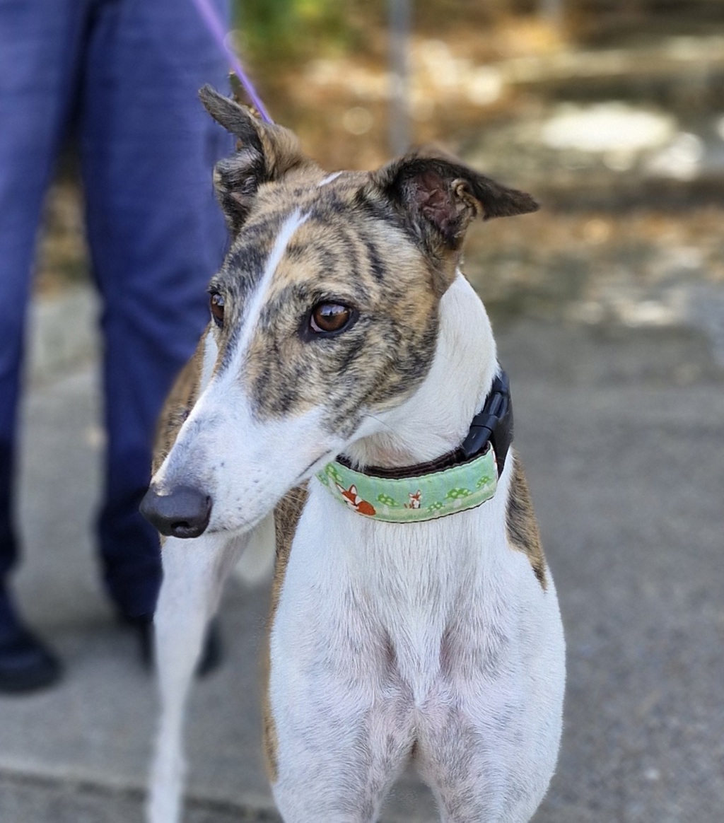 Allyea is a bright and engaging dog, keen on getting to know people and learning how to play with toys. She ponders how they keep getting away from her and has not yet learned how to fetch and give. Considering her early life in the racing world this dog shows lots of traits of a companion dog. Keen to stick around, okay with pats and social contact and very keen to play.