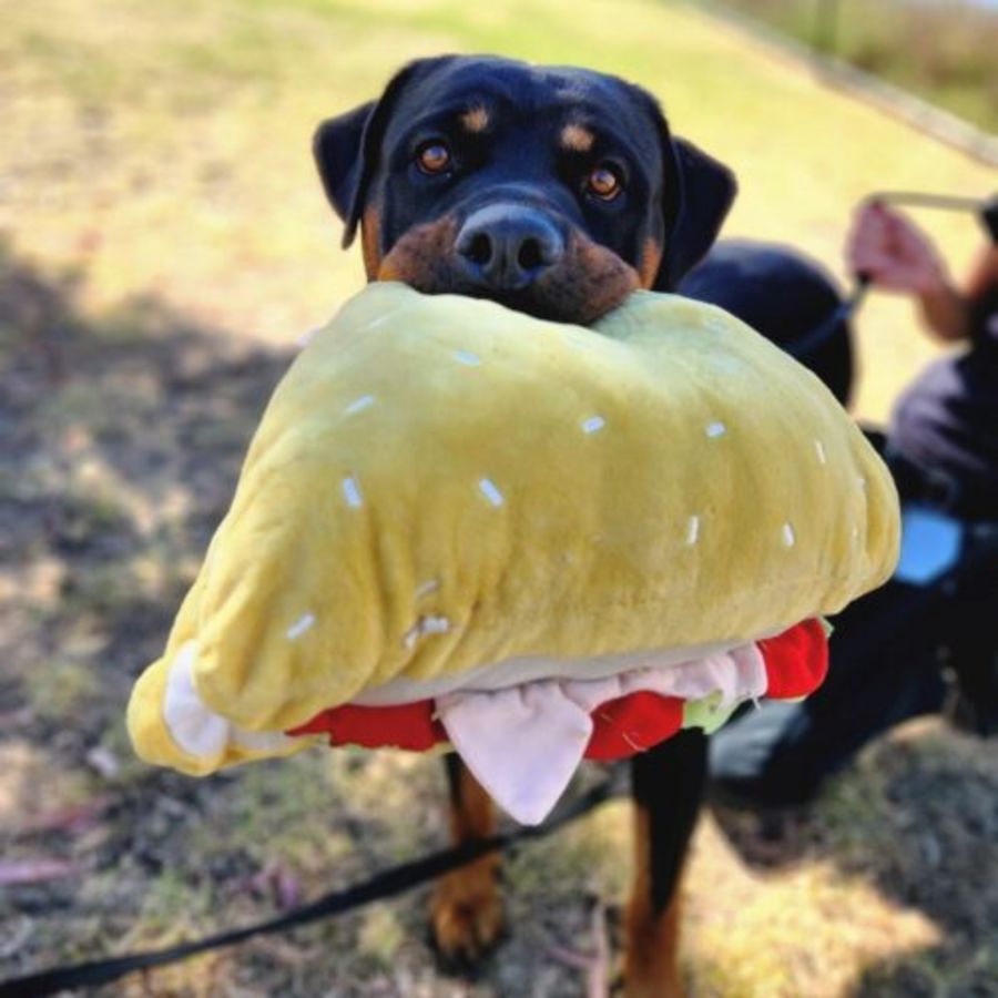 Meet Ava, the Rottweiler ready for a new home adventure! She’s not your average pooch – this girl takes her walks seriously, with a taco toy in tow (and she’s got skills, aiming for a double-stack!).