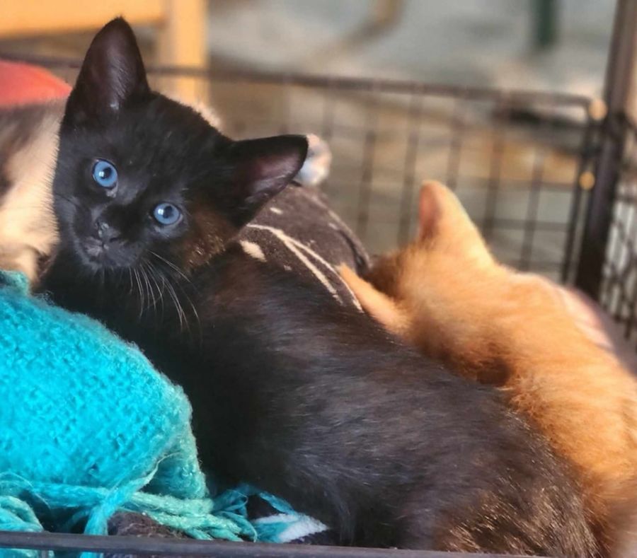 Merlin is the sweetest boy with gorgeous blue eyes!! His coat looks black in photos, but he is actually a very stripey tabby, with shades of black, chocolate brown and grey. He loves sleeping next to a human leg, or under a pile of his siblings, but only after he has worn himself out chasing toys, or climbing a screen door. He is talkative, playful and a very creative sleeper. He is intrigued with our small dog, and he would be lovely as the only pet in the house, but would also fit into a family with other cats or dogs.