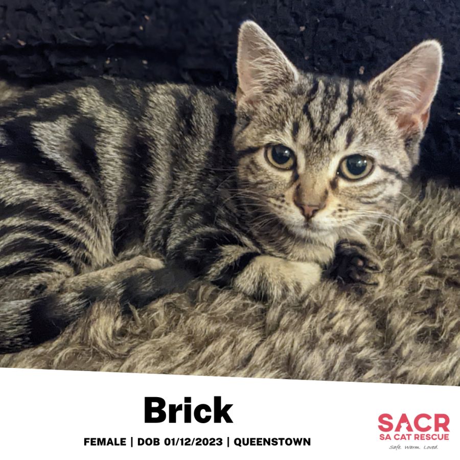 Brick’s adoption fee is $180 which includes desexing, microchipping, parasite prevention, and initial F3 vaccination.