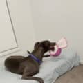 She lost her front leg in an accident when she was a pup. It hasn’t slowed her down. She loves to do zoomies, play with toys, and play with her greyhound foster brother. She enjoys 2 short walks a day.