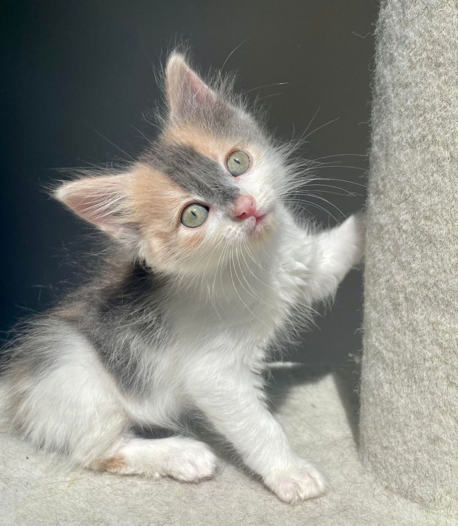 Crunchie is a talkative and social kitten who loves interacting with people, other cats and new toys. Crunchie adjusts very easily in new environments and has an air of confidence about her. She’s not afraid to tell you what she wants! Crunchie is a one of a kind kitten, the perfect combination of independent and clingy. Whether you’re lounging on the couch or doing daily chores, Crunchie loves nothing more than following her human around and being close in your presence.