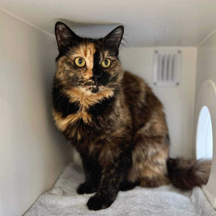 I am a charming and affectionate dark tortoiseshell cat; my eyes are one of my outstanding features as you can see.