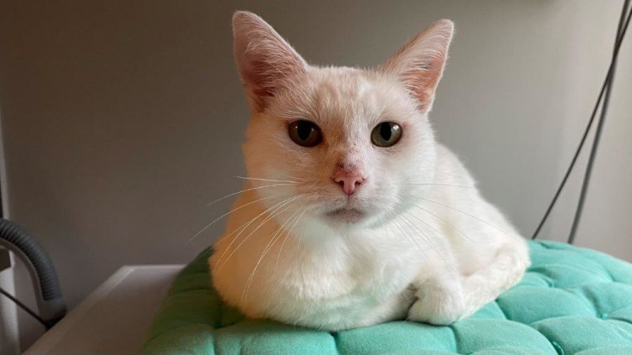 Angel is happy to relax during the day, chilling with people or gazing outside the window and enjoying the warmth of the sun. Angel enjoys attention when she is ready, quickly purring for a good head rub and bumping your hand for more. Sometimes she will give you a gentle lick on the nose or face and then you will get to see her amazing green eyes against her white fur.