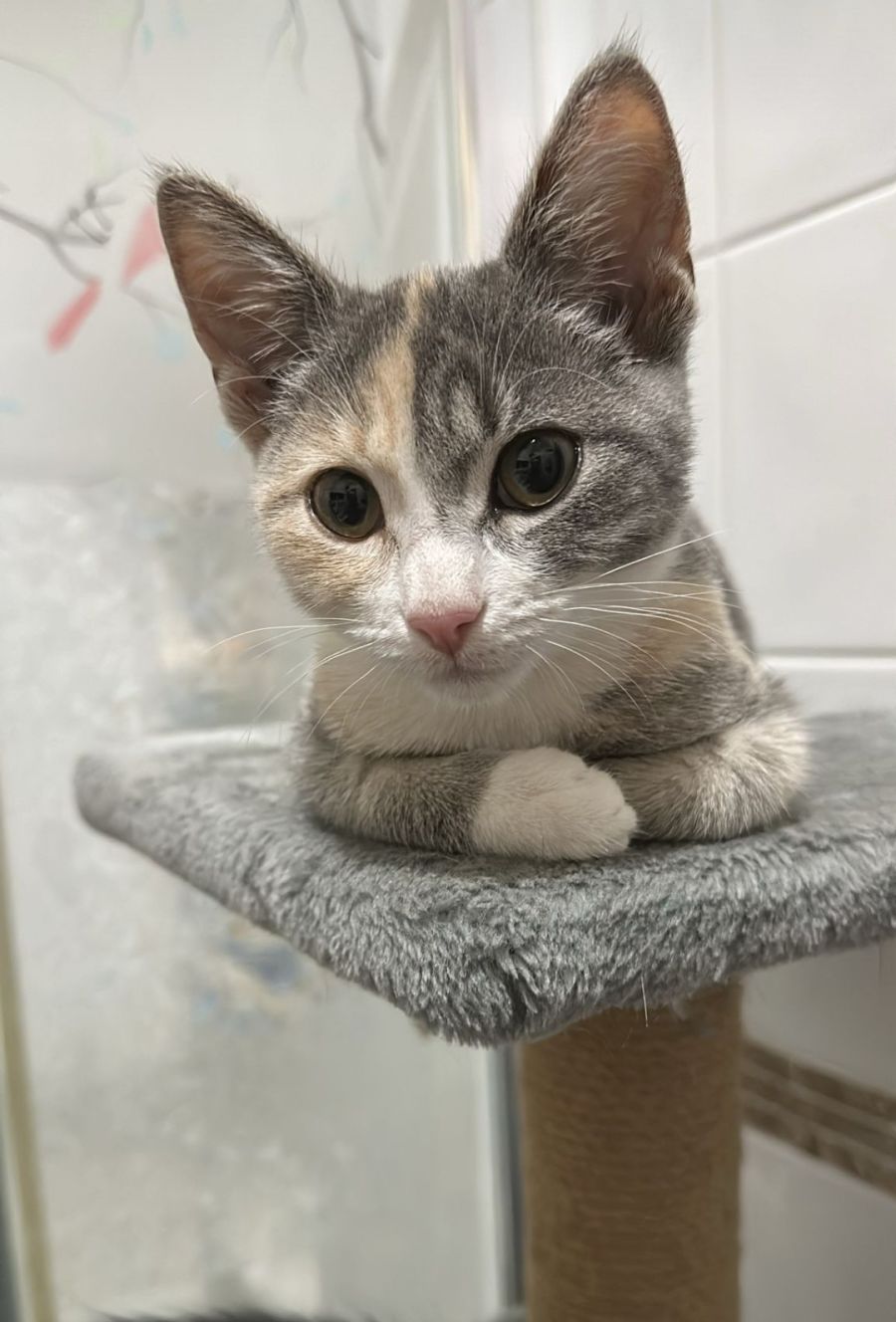 Among her feline friends, she has formed a great relationship with Mr. Fluff. They love to play together, and while she might boss him around, it's all in good fun. This compact bundle of energy comfortably coexists around dogs and kids, making her a great addition to any family.