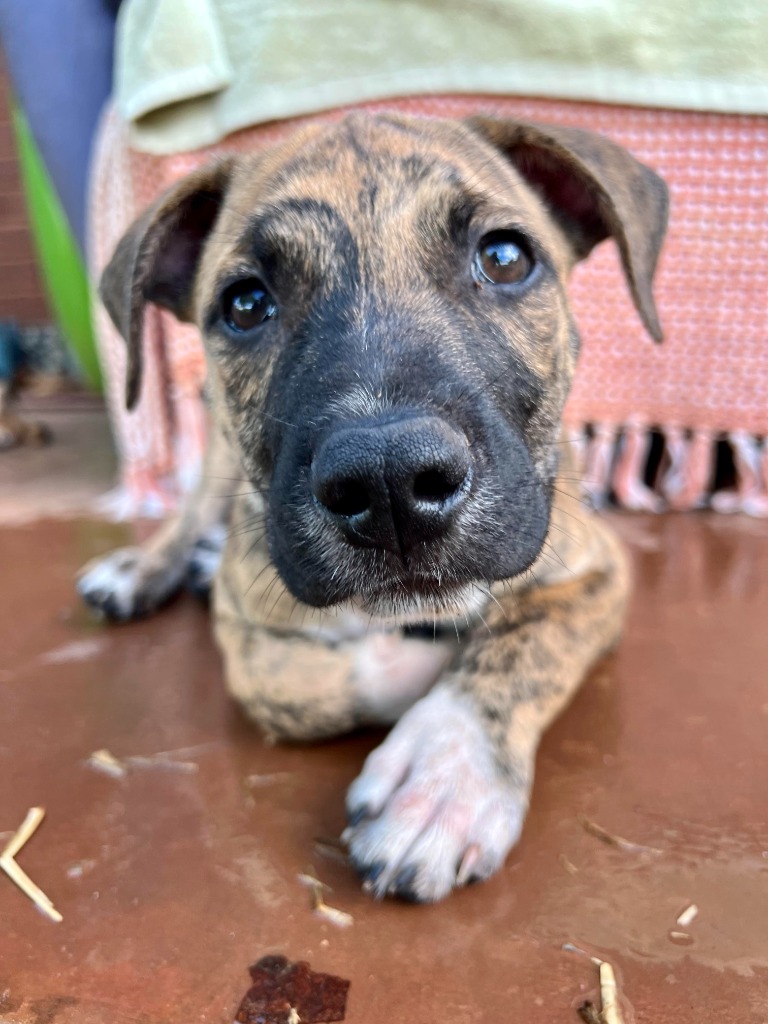 HD2813 Frank is a beautiful little man. With his speccy tiger brindle coat, sweet face to die for and he won’t be a big dog, maybe a good medium size.