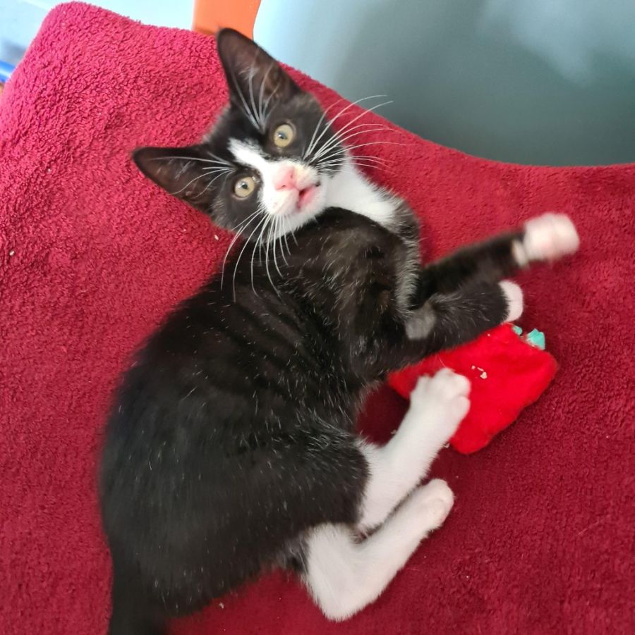 Meet Badger, a sweet and confident kitten ready to create a special bond with his new family. With his thick white stripe proudly adorning his nose and distinct dark tabby stripes on his back, Badger is a unique and endearing bundle of joy.