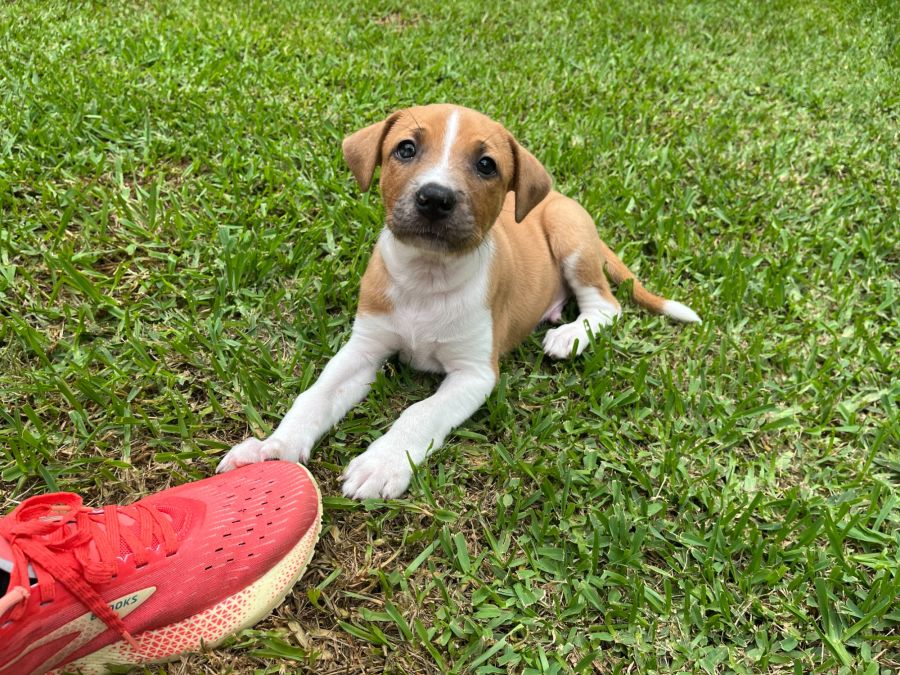 Shepherd is a smart puppy who picks up things quite quickly. He is already taking himself outside to toilet like his big foster brother has shown him as long as the door is open for him. Even at night, he is settled in his crate with a stuffed toy and sleeps right through from 8:30pm to 6:30pm. Shepherd has been learning how to sit and wait for his food. He is doing very well walking on a lead, but we think it’s because he sees his big brother do it too. We know Shepherd’s dad was a medium sized mixed breed and a lovely friendly boy. We suspect mum may have been a bit larger and we are expecting Shepherd will grow to a larger size (possibly in the range of 25-35kg). It is very important for his new family to be committed to his training and development. We want him to reach his potential and be an excellent canine citizen that can travel along to lots of fun places with his owners.