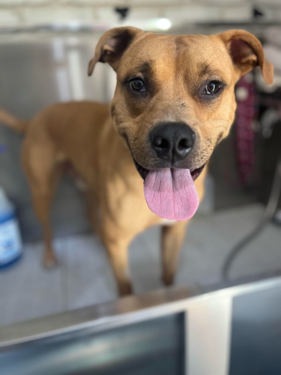 He is smaller than he looks in his photos, being a 1 year old male staffy x.