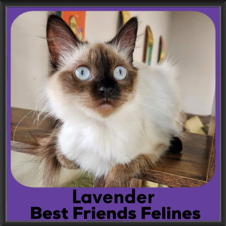 Noise and new people don’t phase Lavender either, so she would be a wonderful addition to a young family, or someone who likes to entertain at home. She is still learning to do zoomies, jump up, and play without claws, and doesn’t know what personal space is yet so would need to be supervised around very young children and cribs. She is content in her own company for short periods, but would do best in a home where she can be around people and maybe another cat for playtime as much as possible. Lavender is very intelligent and could potentially be trained as a companion/support cat for someone looking to go through that process. She is very comfortable in public where appropriate and when restrained, and travels well in the car.