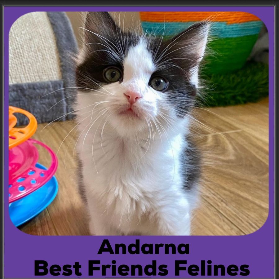 Andarna is a sweet and cuddly kitten who is looking for her forever home. Andarna is very affectionate and enjoys being held and snuggled by humans. She has super soft and silky fur that you will love to stroke. When not being adored, she is very adventurous and loves to climb on anything she can find. She is not afraid of heights or new places, and she is always curious and playful. Andarna is a sweet and friendly kitten who will make a great companion. To arrange a meet to see if this could be your perfect match, please submit our meet’n’greet form.
