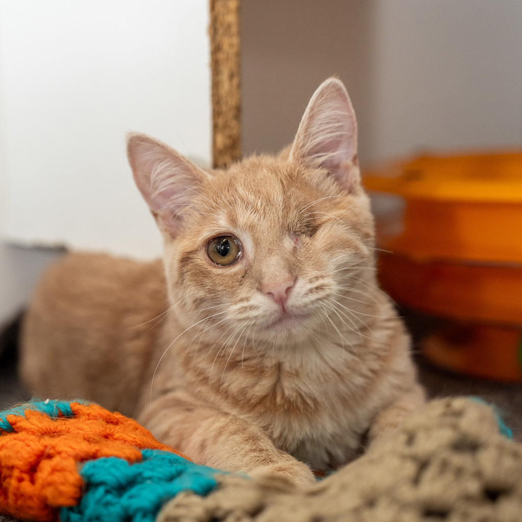 Trilogy is a gentle and resilient young kitten who is looking for her forever home. Despite facing the challenge of only having one eye, Trilogy has an admirable outlook on life and is very affectionate and loving once she warms up to you.