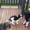 Hughie has a lovely black and white, fluffy (non-shedding) coat which means he would benefit form a clip in the warmer months as he gets older. He is in a crate at night with no issues, happily toileting in the morning outside after being let out. He would need some more toilet training to be inside full-time, but he's well on the way and is showing all the right signs.