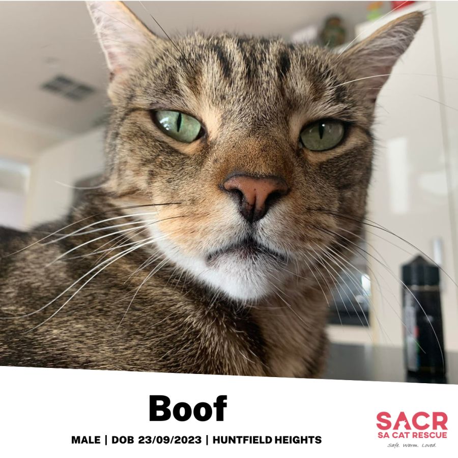 Boof’s adoption fee is $75 which includes desexing, microchipping, parasite prevention, and initial F3 vaccination.