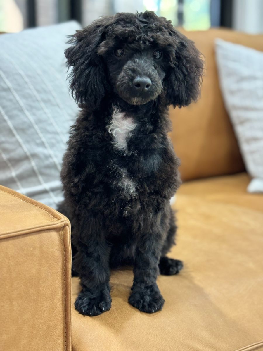 Buzz has a lovely black non-shedding/hypoallergenic curly coat and would need grooming in the warmer months to keep him comfortable. He is in a crate at night with no issues, happily toileting in the morning outside after being let out. He would need some more toilet training to be inside full-time, but he's well on the way and is showing all the right signs.