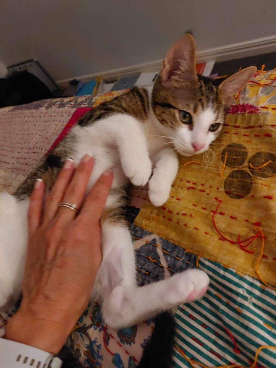 I enjoy snuggling up next to you and I enjoy keeping you company and comfort with happy purrs all day long. Did I say I love belly rubs, because that is a must in my forever home, seems I canât get enough!