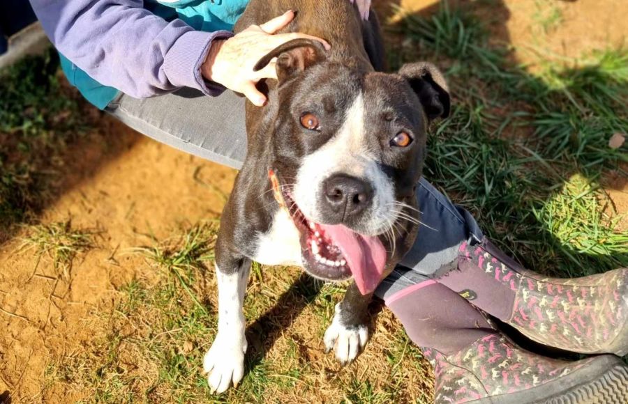 Meet the lovely Maggie, a charming American Staffy mix with a heart as big as her smile. Behind her gleaming eyes is a delightful soul, filled with joy and love. From her wagging tail to her delightful disposition, she is an outgoing, cheerful dog who will always light up your day.