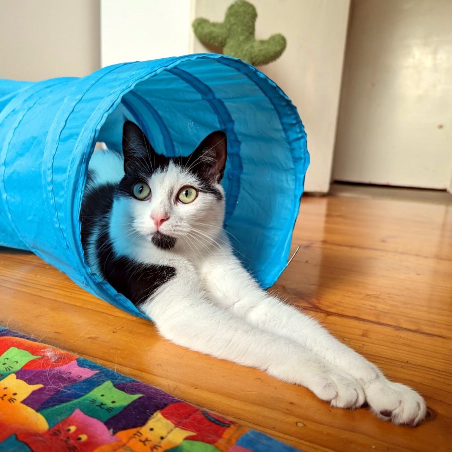 Pineapple may not be the most affectionate but she’s very curious and loves company. it may be difficult for others to read her behaviour as to when she’d like affection (she hasn’t yet learnt to ask for this) she’s definitely got the potential to become more affectionate. she will take anything as a toy, including a pebble and her own shadow (seemingly chasing her tail).