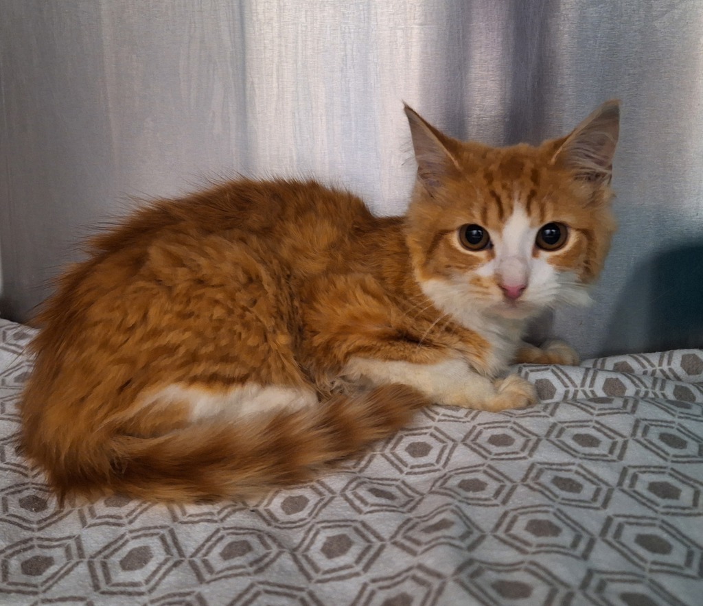 Goose is a charming 4-month-old kitten with a ginger coat. He may start off a bit shy in new situations, but once he feels comfortable, he's incredibly affectionate. Goose loves nothing more than gentle pats and cuddles.