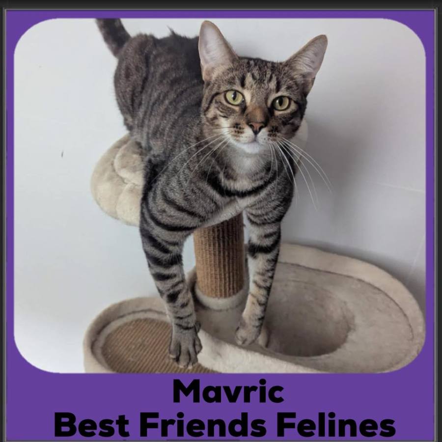 Mavric is an absolute goofball! His interests include hunting for cat toys, sitting in the sink, sitting at the absolute top of the cat tree and swiping (paws no claws) at anyone that walks past and being first in line for food.