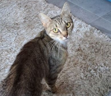 - She has been tested with a visiting dog, her response is to find a hiding place. She is not tested with other cats or with children.