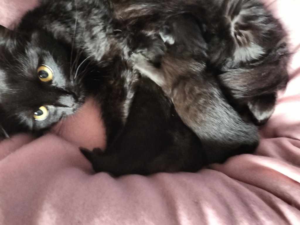 Violet and her sister are very close and co-parented both their litters together, sharing all feeding and caring duties for their kittens between them. You can read all about Anthler here: