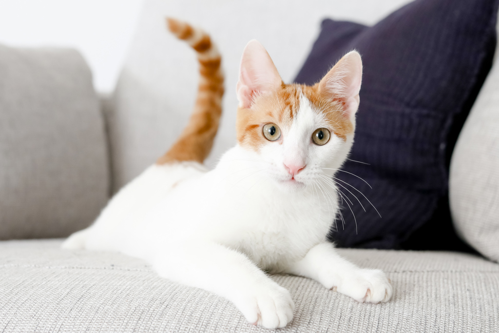 Melon is the little boy of the pair. He is affectionate, loving and super entertaining. He will often get the zoomies and race happily around, leaping from couch to couch until he is panting like a dog. He loves his toys and will carry them proudly around in his mouth and has a great time pouncing the resident dog's feet and chasing her wagging tail. Melon is often referred to as a 'liquid cat' because of how flexible and seemingly liquified he looks, regularly napping so deeply with his head flopping off the side of the couch like he's being poured over the edge!