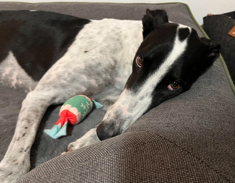 At four years old, Zorba is a happy and confident greyhound who adores people. He loves affection and pats and will cuddle up close whenever he can. He enjoys playing with toys and is a very good boy because he does not play to destroy them.