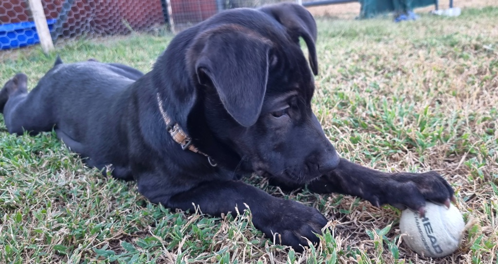 Unlike her brothers Franzi is on the quieter side, she is a happy girl that likes to play on her own some days, on other days she likes playing under the sprinkler or with her favorite tennis ball or chewing on a bone.