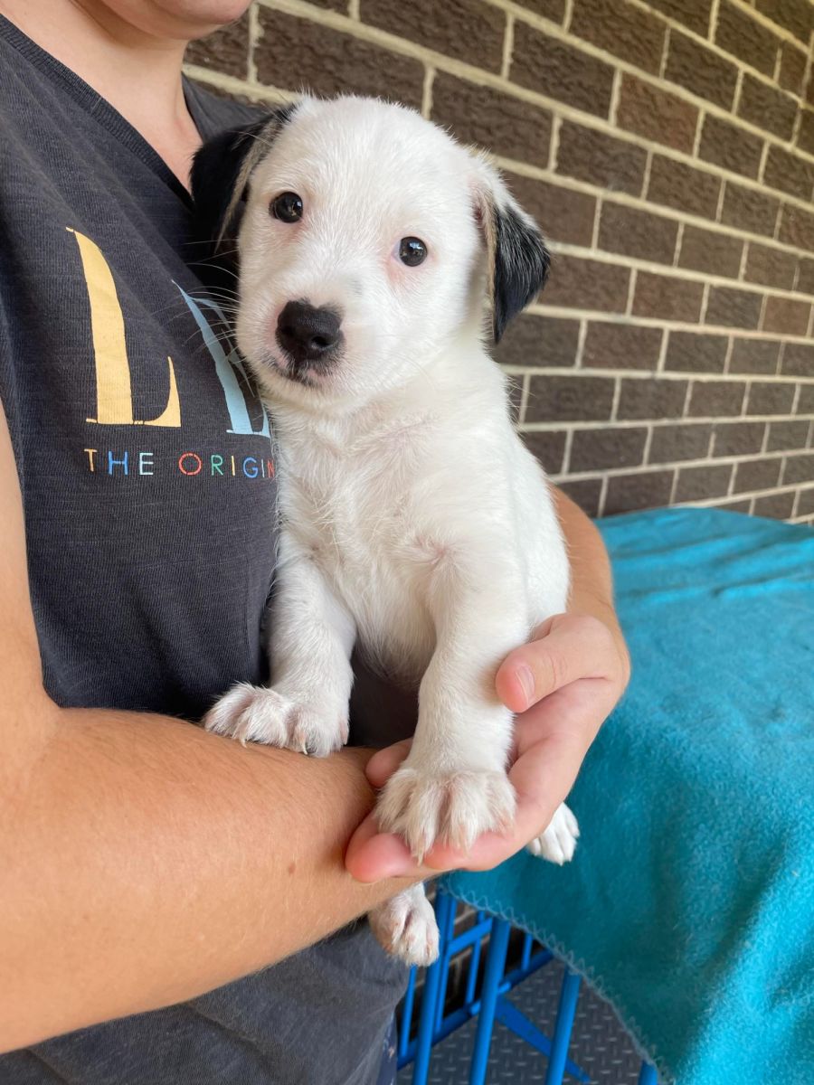 Splash came into care with his siblings from a rural NSW facility as they were an accidental litter. His parents were an odd match to say the least. His dad is a longer haired, small white fluffy who looks Maltese in type. His mum is a working breed type possible with other breeds mixed in. Due to the disparity in sizes between the parents, it’s difficult for us to precisely say how big Splash will get, but he was only a small 1.2kg at 6 weeks old. We have had litters with similar mixes before and some pups ended up small and others medium, so any potential home interested will have to be happy with a dog who is between small and medium size.