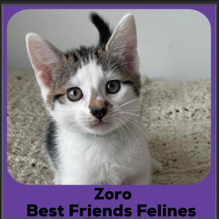 Ohh Zoro, you are a charmer! Zoro is a sweet little lad with a loving disposition and glorious, glossy soft fur. His current hobbies include napping, frolicking, and cuddling his carer’s foot before heading off for a snack. Zoro enjoys running around the house and playing with his siblings (especially his brother Sanji), along with being cuddled by his carer and being told what a good boy he is. Zoro has an enchanting, teeny-tiny little purr, which he displays frequently when having cuddles. Zoro would suit a range of household types but has no experience with animals other than cats.