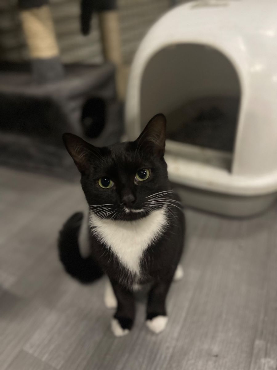 Meet Floyd, a charming little feline who's about 5 months old and is known for his adorable little white mustache. Despite initial shyness due to his past, he's incredibly sweet and has a unique personality that is beginning to blossom.