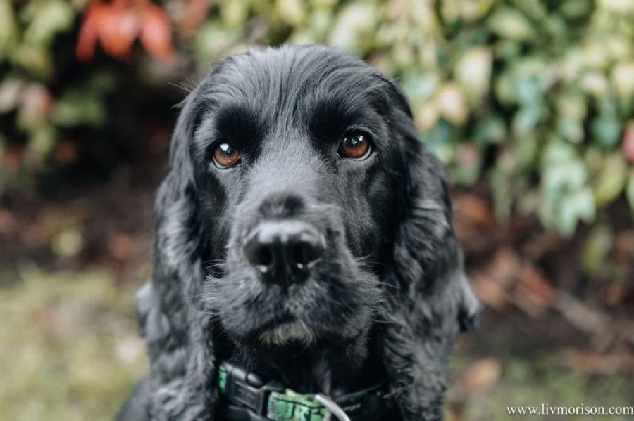 Scarlett’s clipped, glossy black coat, pendulum ears and liquid brown eyes are hard to resist. She loves to peer into my eyes; so hard to resist looking into hers. She is a small, compact/chunky Cocker Spaniel.