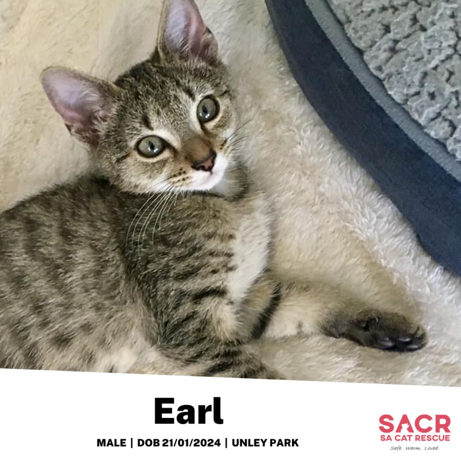 Earl's adoption fee is $180 which includes desexing, microchipping, parasite prevention, and F3 vaccination.