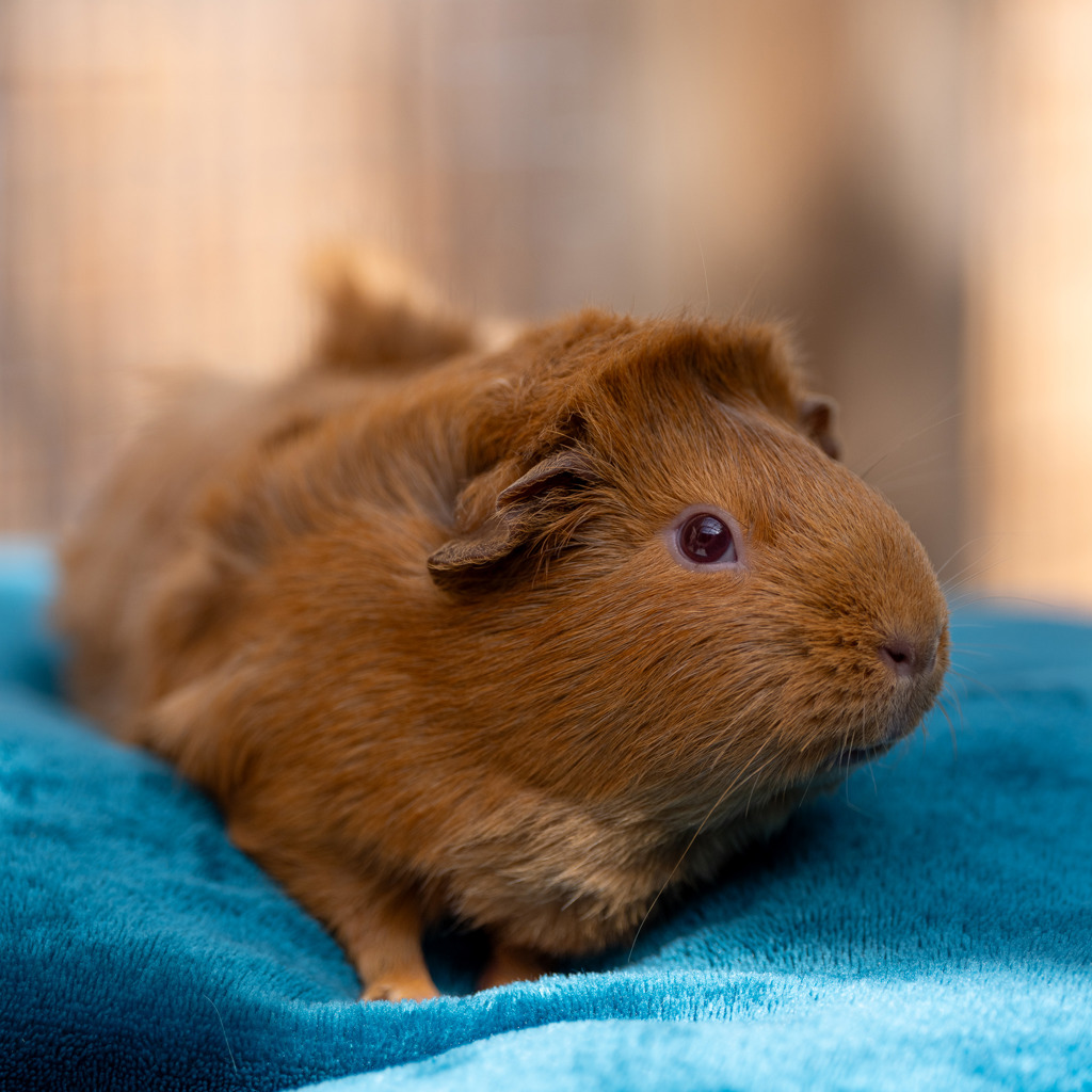Meet Colt, the ginger, scruffy-haired, and plump guinea pig with a heart as big as her appetite for snuggles! Colt found herself in a bustling piggy family of over 30, but now she's ready to find her forever home, snuggled up currently with her 10 sisters at the shelter.