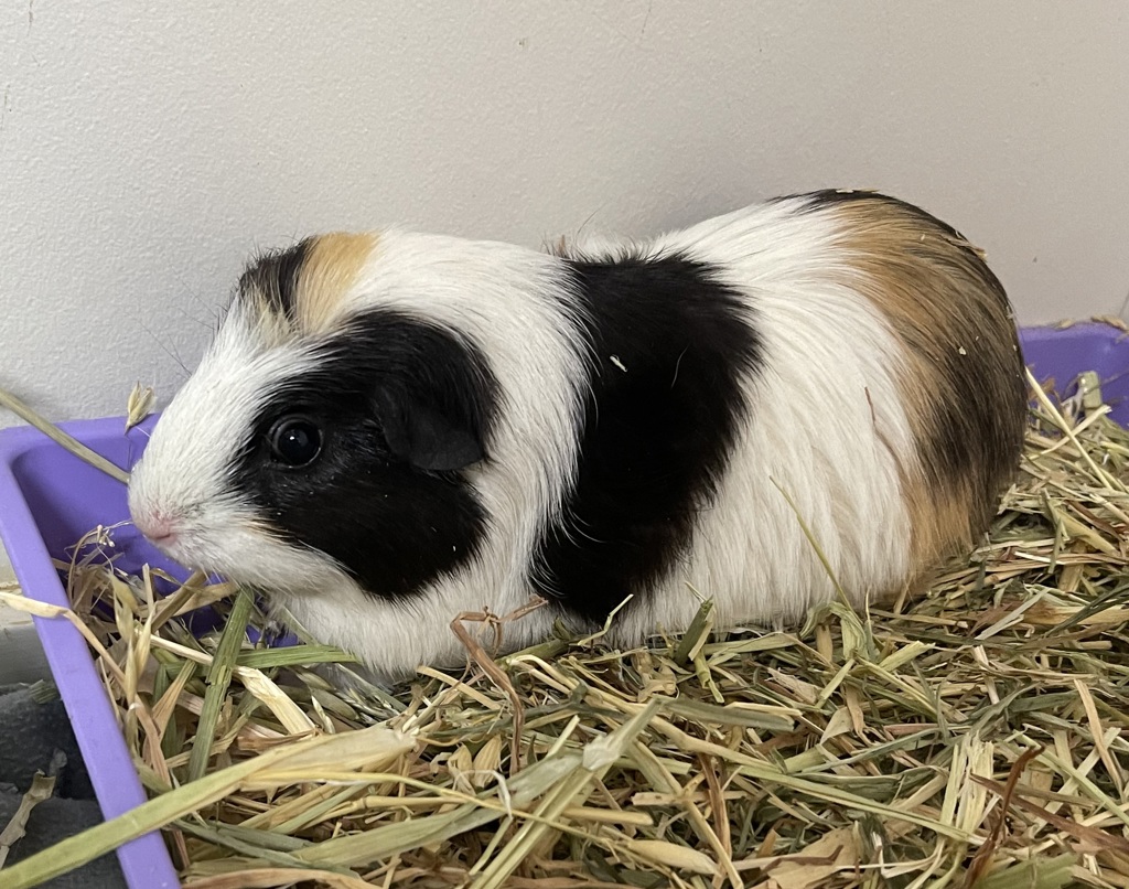 Meet Farrow, the delightful tri-color guinea pig with a passion for the finer things in life, starting with breakfast in bed! This charming little lady can often be found in her plush igloo, indulging in a delicious feast of grass while snuggled up with her sisters. Farrow arrived at the shelter with 30 other guinea pigs and is now happily sharing her enclosure with approximately 10 other female pigs.