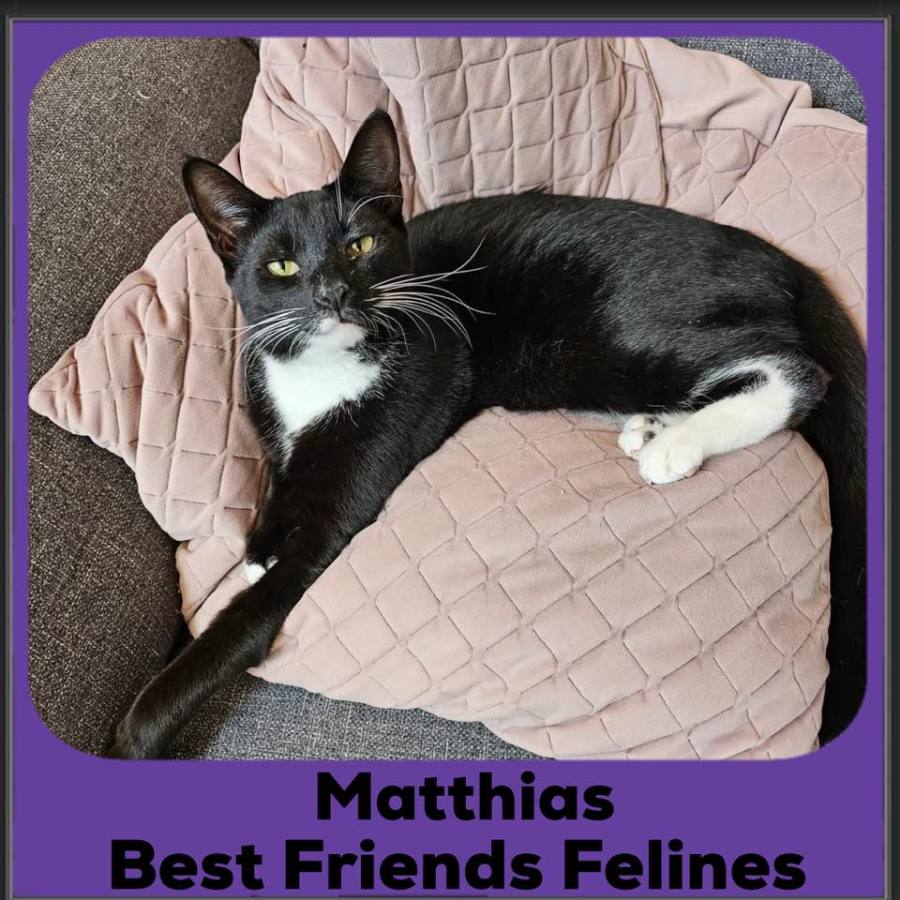 Matthias is a handsome tuxedo with the cutest face and huge green eyes. He likes to rub against your leg for attention or food and perch near your shoulder on the couch. He accepts pats and being picked up and carried around but then gets a bit wriggley and wants to get back to perching on his cat bed/post.