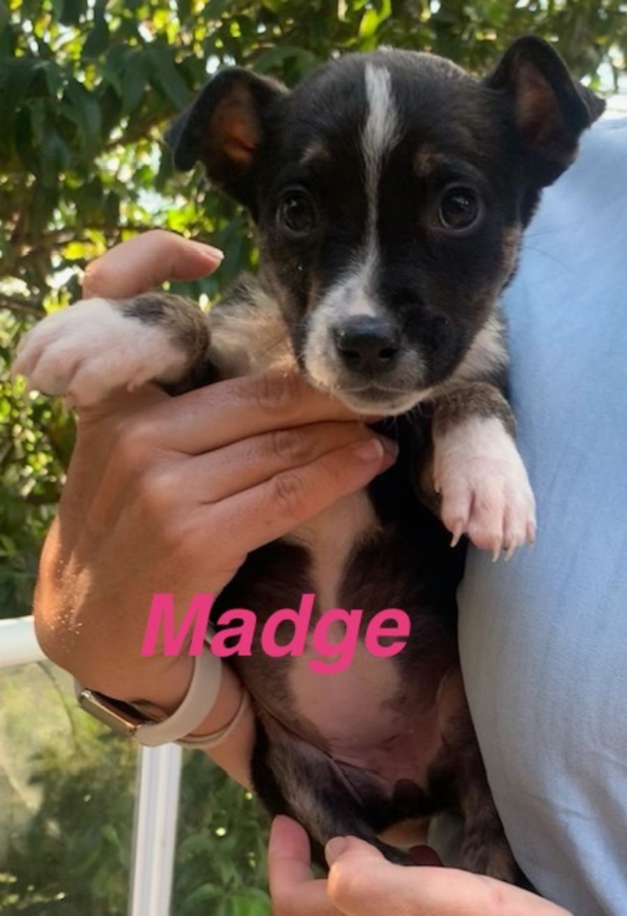 Madge and her siblings were rescued from a country pound and are now settling in beautifully in their foster home. They have been registered as Tenterfield Terrier cross, but their foster mum thinks they may also have Kelpie in the mix. Madge is very affectionate and smart. She loves to play with her siblings and enjoys rumbling and tumbling with them. Madge would love to find a home with a family who allows her inside and includes her in family activities. Regular walks and a nice sized yard would be perfect for Madge. She would also benefit from puppy preschool to help with socialisation and training, so she can grow into a happy well balanced young lady. Madge is the smallest in her litter at 2kg.